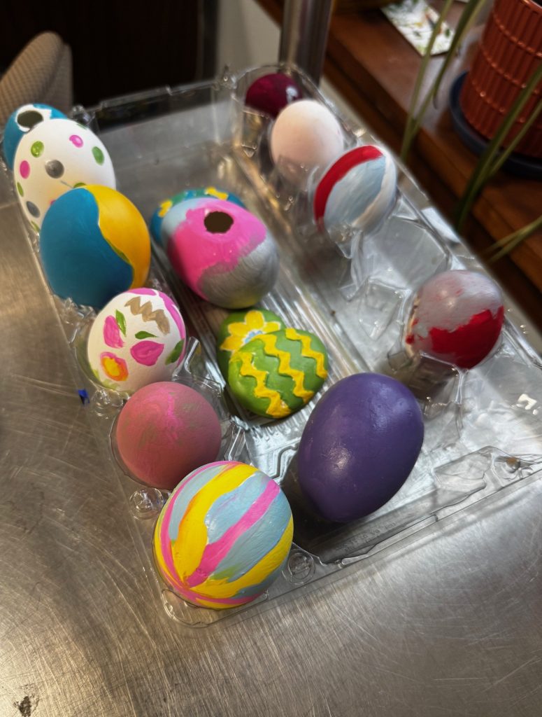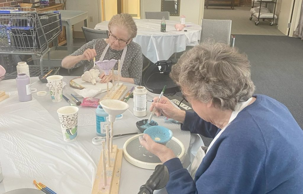 With Easter just a few weeks away, the Residents have been busy decorating eggs. Here is Resident Charleen McQuillan painting a decorative egg to give to her family. The Residents of the Jeanne Jugan Pavilion have been working all winter long painting ceramics flowers for the Spring sale. Here are Residents Caryl Lupinacci and Kathy LeBlanc working on posey flowers, which will be part of our online sale starting this month.