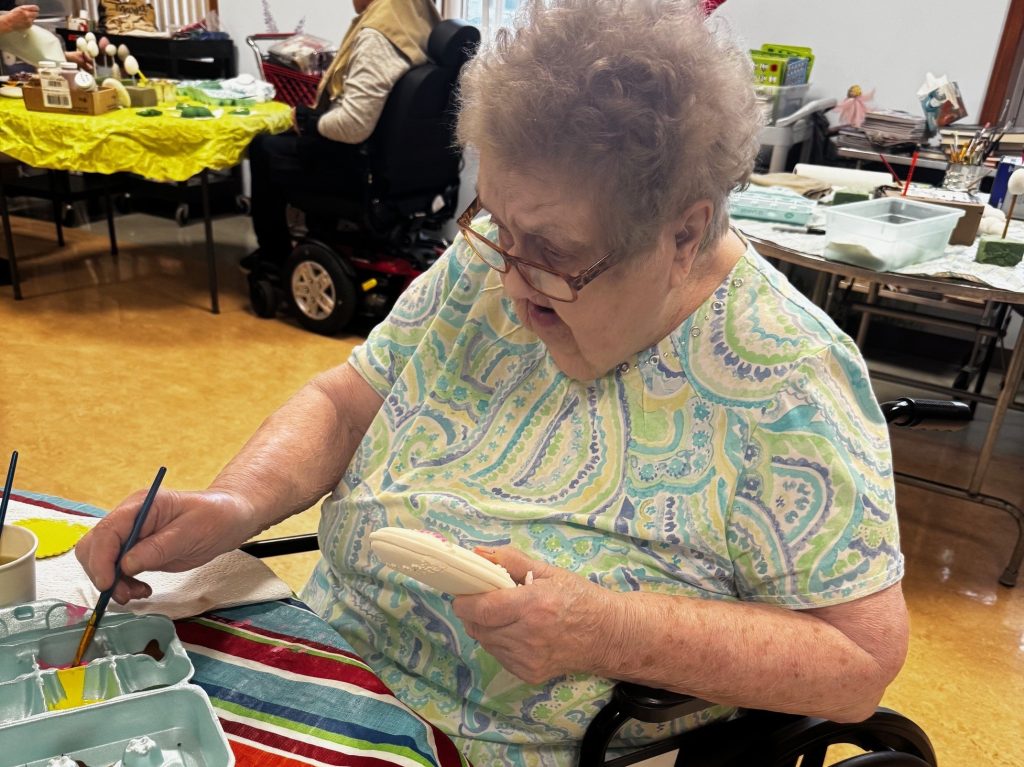 With Easter just a few weeks away, the Residents have been busy decorating eggs. Here is Resident Charleen McQuillan painting a decorative egg to give to her family. The Residents of the Jeanne Jugan Pavilion have been working all winter long painting ceramics flowers for the Spring sale. Here are Residents Caryl Lupinacci and Kathy LeBlanc working on posey flowers, which will be part of our online sale starting this month.