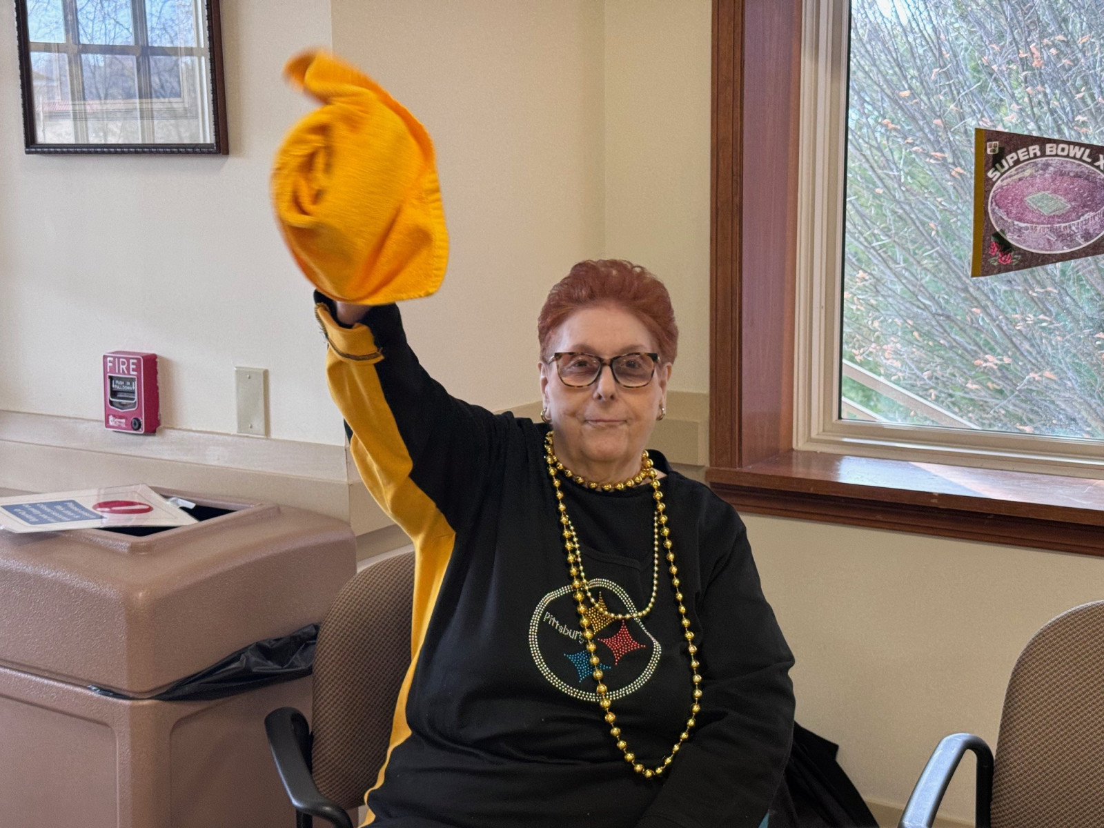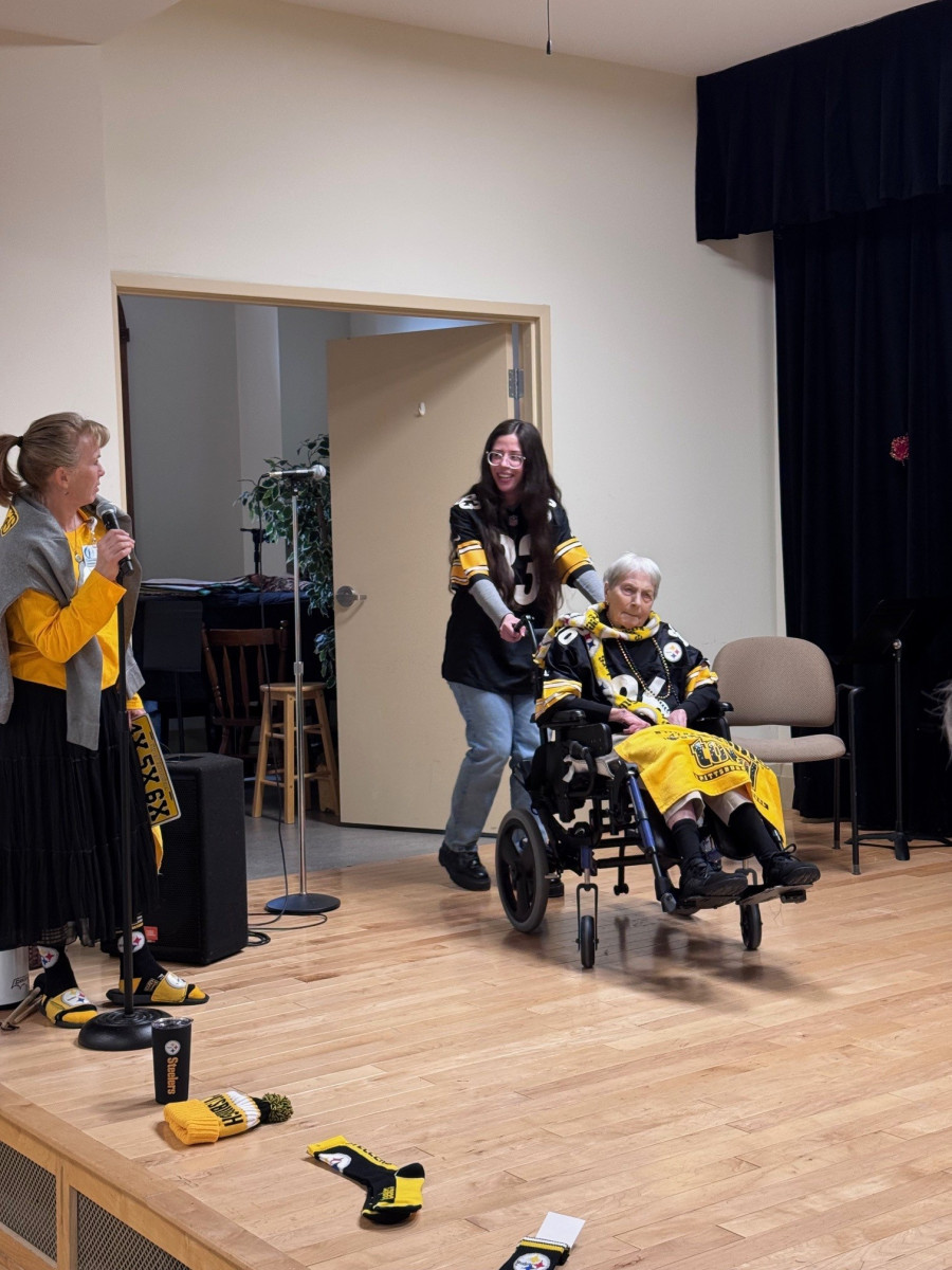 The Residents, Sisters, staff and volunteers were thrilled to show off their support for the Steelers prior to Monday’s playoff game. Anyone dressed to impress in Steelers gear was invited to walk across the auditorium stage. Football-themed snacks including decorative cookies were provided, as well.